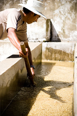 With the wet method, the cherries are put into large tanks with flowing water. Via water-washing channels they are transported to the pulper which removes the pulp of the fruit. The silver skin is then removed from the macerated beans and dipped into water again. Finally the beans are separated and sorted.